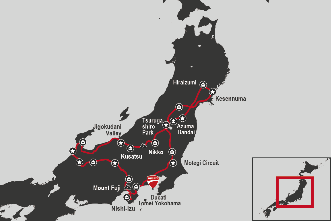 An adventure perfect for real DUCATISTI! A dream travel route, to be lived riding on dream vehicles like DUCATI. Discover the dramatic Sanriku coastride and the legendary beauty of Sendai, the unique Chirihama beach and the beautiful Japanese Alps, all starting from Mount Fuji - the symbol of the Land of the Raising Sun.