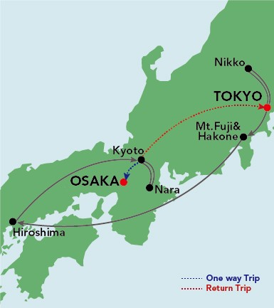 - One way - Tokyo (3 nights), Hakone (1 night), Hiroshima (1 night), Kyoto (3 nights).