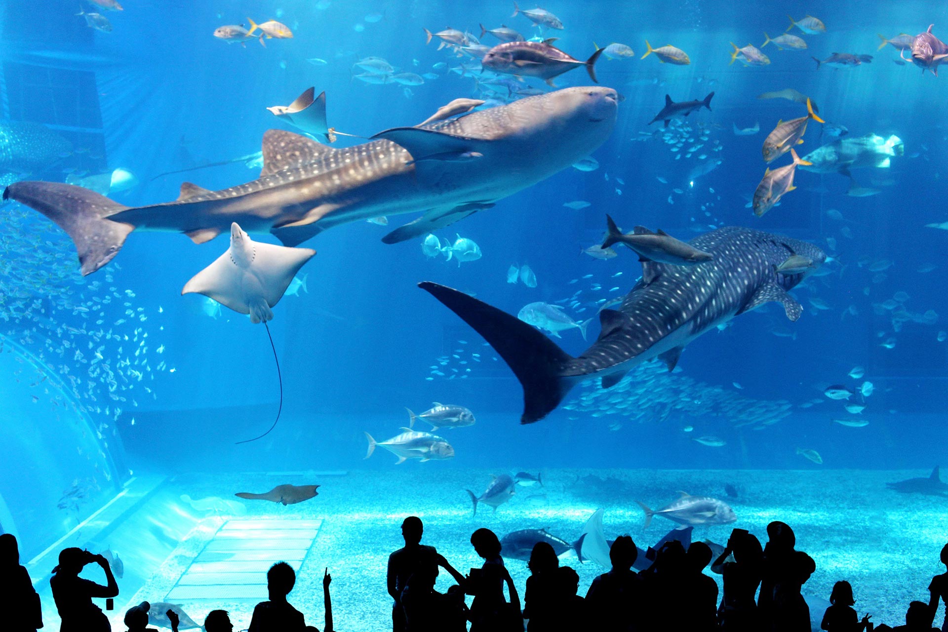 Churaumi AquariumThe highlight of a visit to the Churaumi Aquarium is the massive Kuroshio Tank, one of the largest in the world. The tank contains a wide variety of species, the most striking of which is the giant whale sharks and manta rays. |