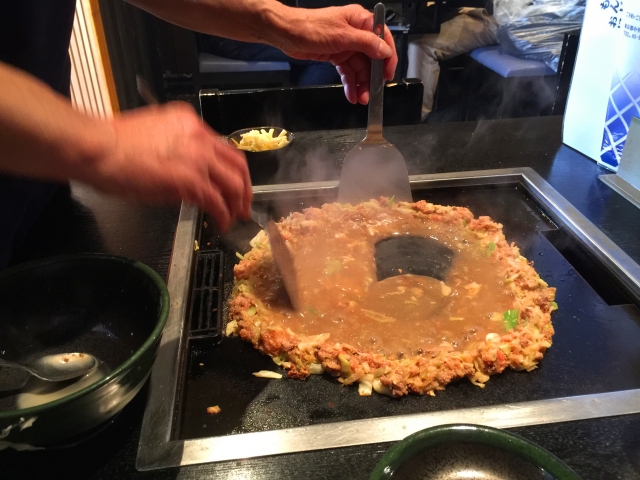Monja-yakiMonja-yaki is a type of runny pancake, which is made from sliced cabbage, small pieces of seafood and meat, which are then cooked on a hot grill. A small spatula is used to scrape some of the cooked it and eat it off the grill. |