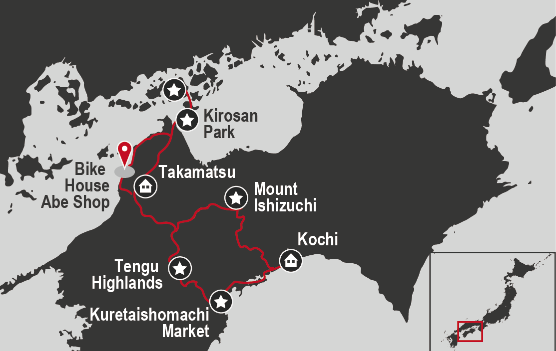 On your Blue Island Shikoku Tour, you will be riding all the way on the Shimanami Kaido, a coast ride where you will be able to feel the marvellous Blue Island at its best. In Shimanami you will have the opportunity to purchase the rich seafood BBQ of Setouchi and enjoying Mount Kaero's wonderful view. At the end of the day you will then enjoy the hot spring waters of Dogo Onsen, recognized as one of the most ancient hot springs in Japan. Our recommendation is also to take a pleasant walk around the area.